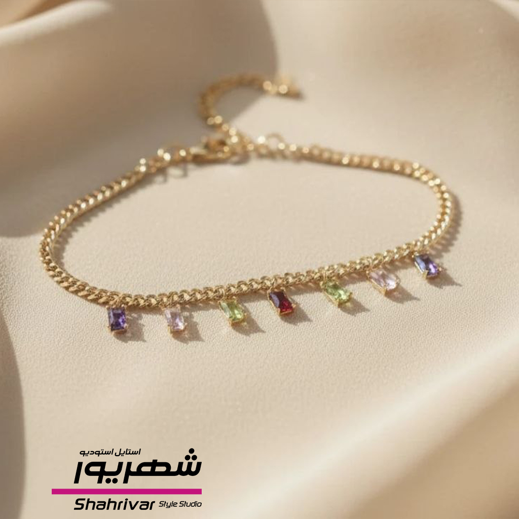 زنجیر دست یا تمیمه استیل طلایی زنانه با پلاک جواهری