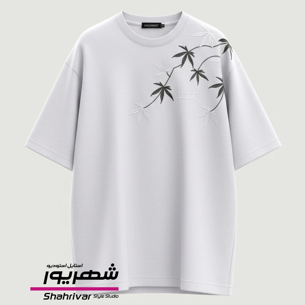 ناموجودتیشرت سفید با گلدوزی برگ زنانه و مردانه ماچینیست