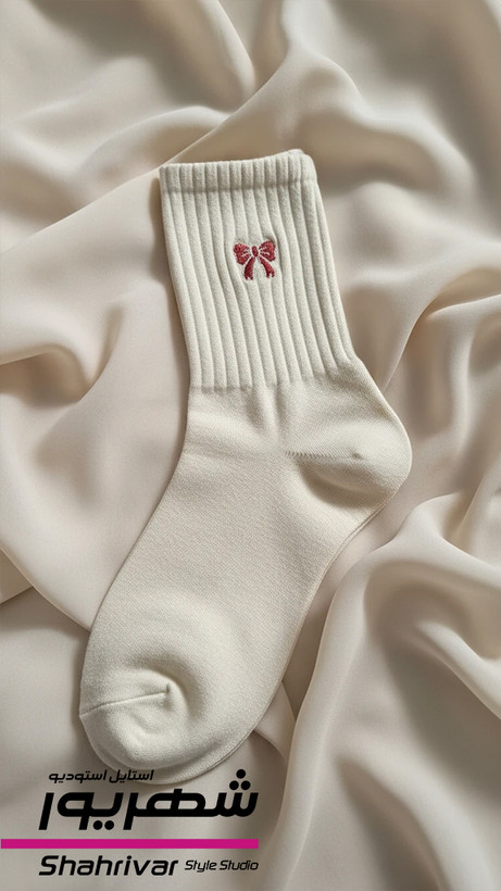 جوراب فانتزی زنانه شیری با پاپیون زرشکی
