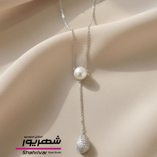 ناموجودگردنبند نقره ای مروارید و نگین اشکی جواهری زنانه آویز دار