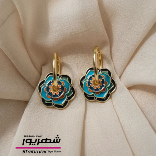 ناموجودگوشواره حلقه هندسی گل آبی فیروزه ای زنانه میناکاری