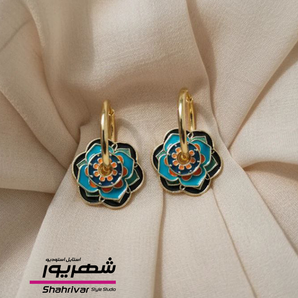 ناموجودگوشواره حلقه هندسی گل آبی فیروزه ای زنانه میناکاری
