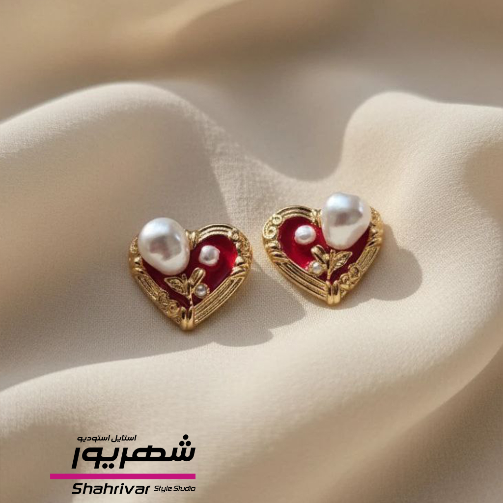 گوشواره قلب قرمز طلایی گل مروارید زنانه میناکاری وپینگ